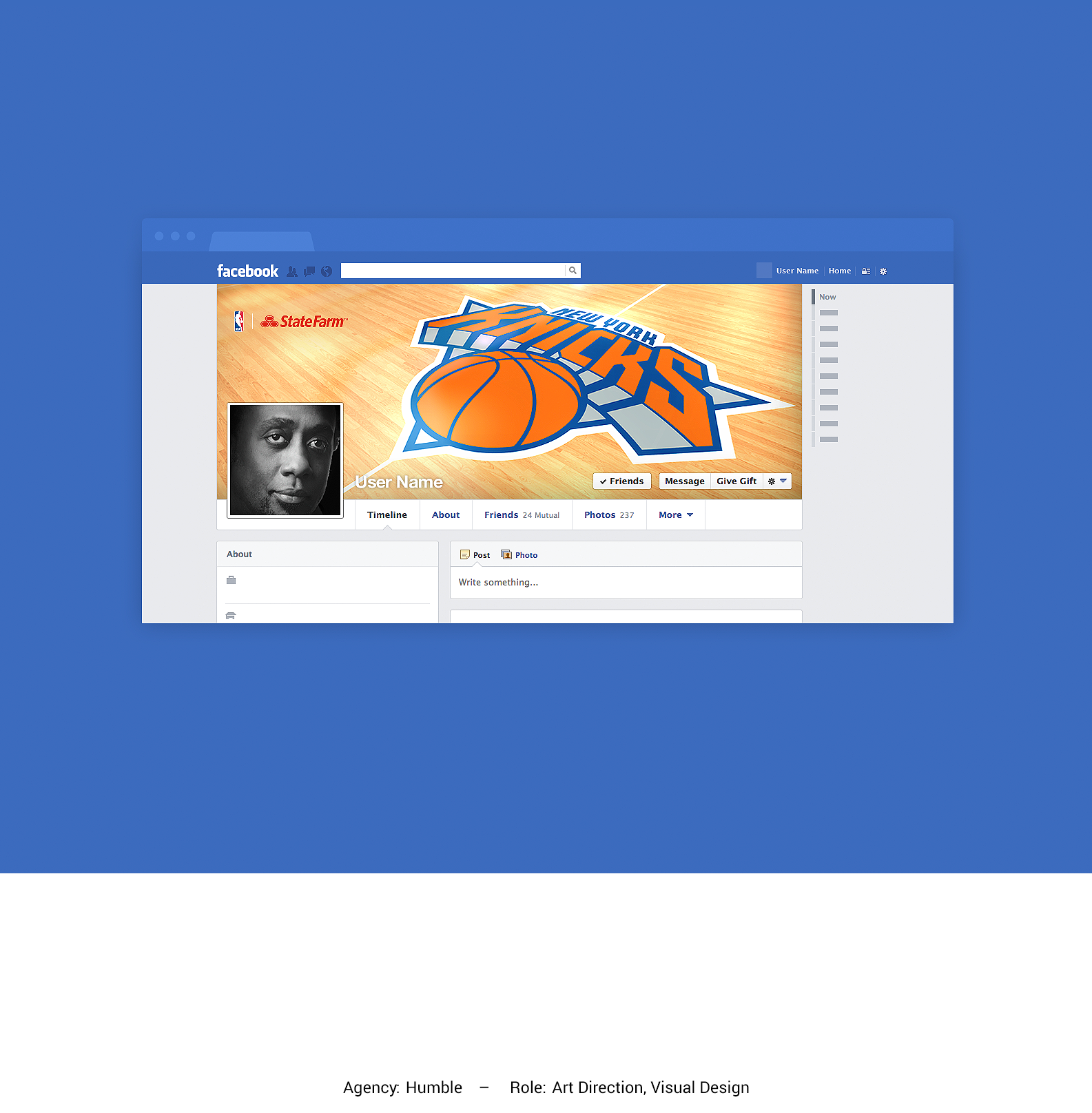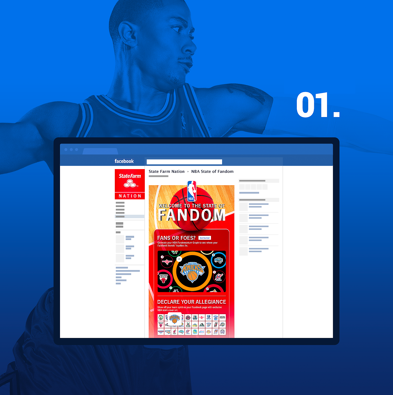 State Farm an NBA sponsor wanted to extend their affiliation with the NBA into the social realm, so we helped them create a Facebook app for NBA lovers all about fandom, a place where fans can explore everything NBA including a chance to win a trip to the NBA finals and also watch and share funny spots about fans.
